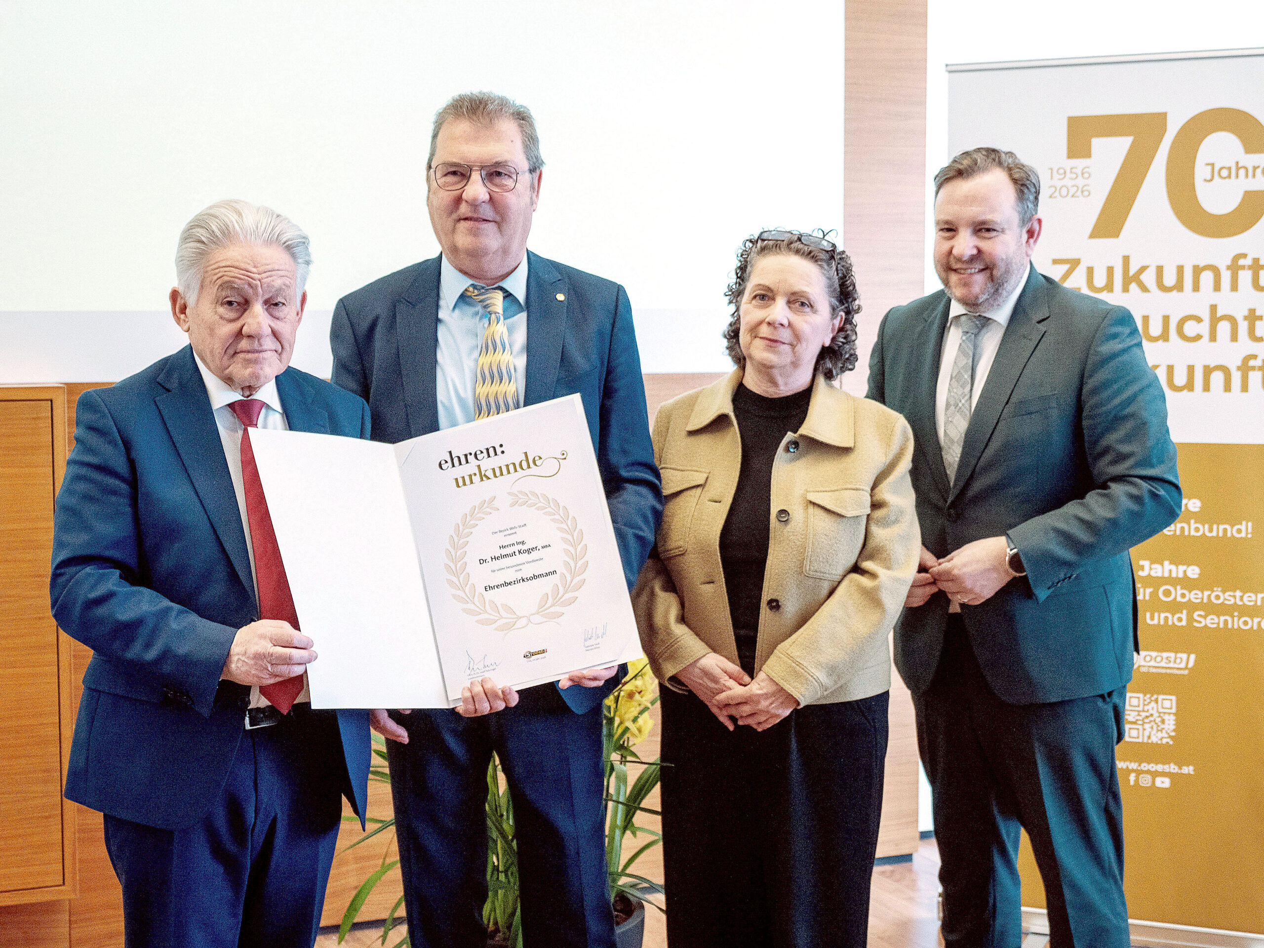 Wels: v.l.: Landesobmann LH a.D. Dr. Josef Pühringer, Ehrenbezirksobmann Dr. Helmut Koger MBA, Bezirksobfrau Gabriele Seidl, Landesgeschäftsführer BR Mag. Franz Ebner.